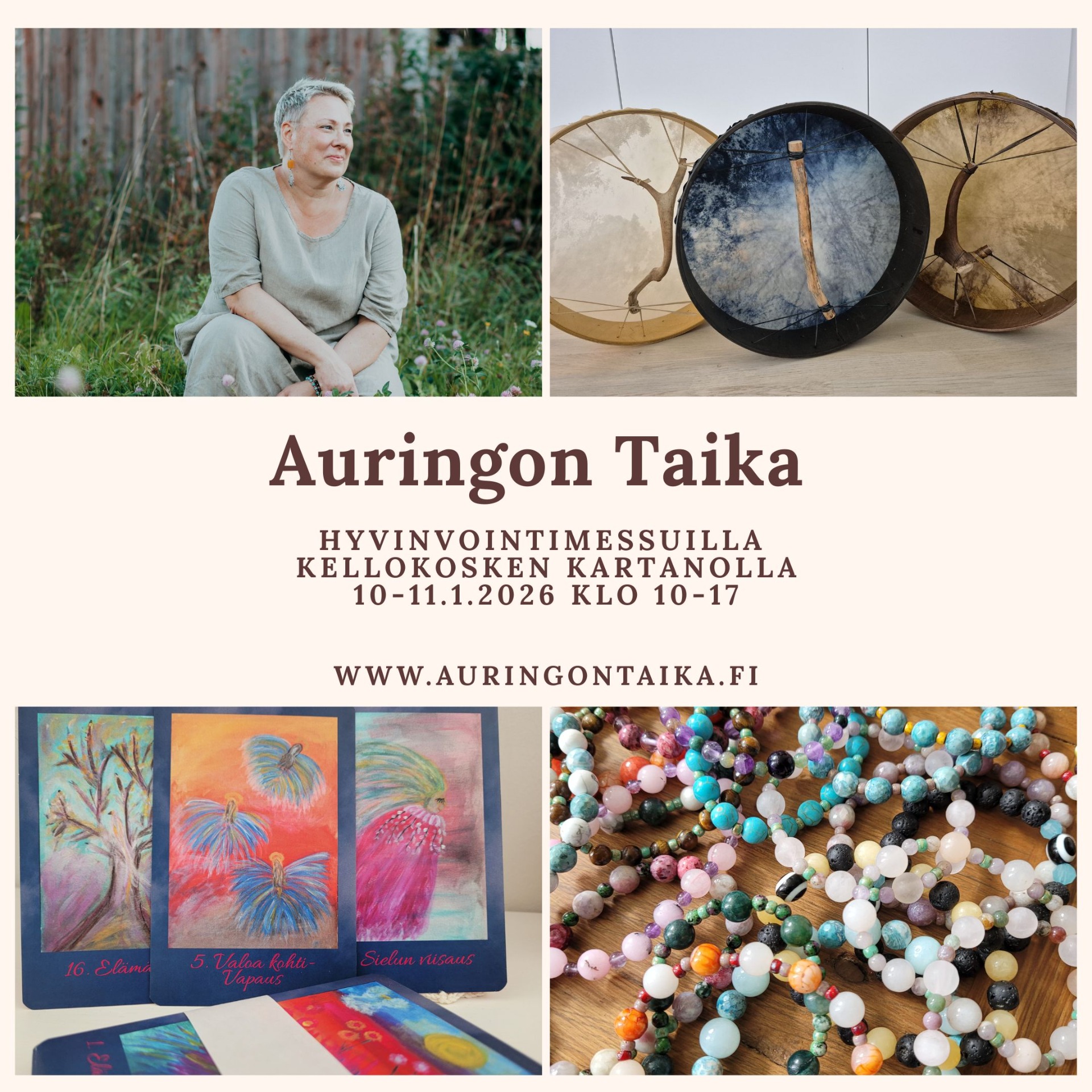 Vuosi 2026 käynnistyy osaltani heti tammikuussa Kellokosken Hyvinvointimessuilla 10-11.1 2026. Auringon Taika-osastolla on upea kattaus rumpuja, koruja, tulkintapiste ja tietysti taidekorttejani.